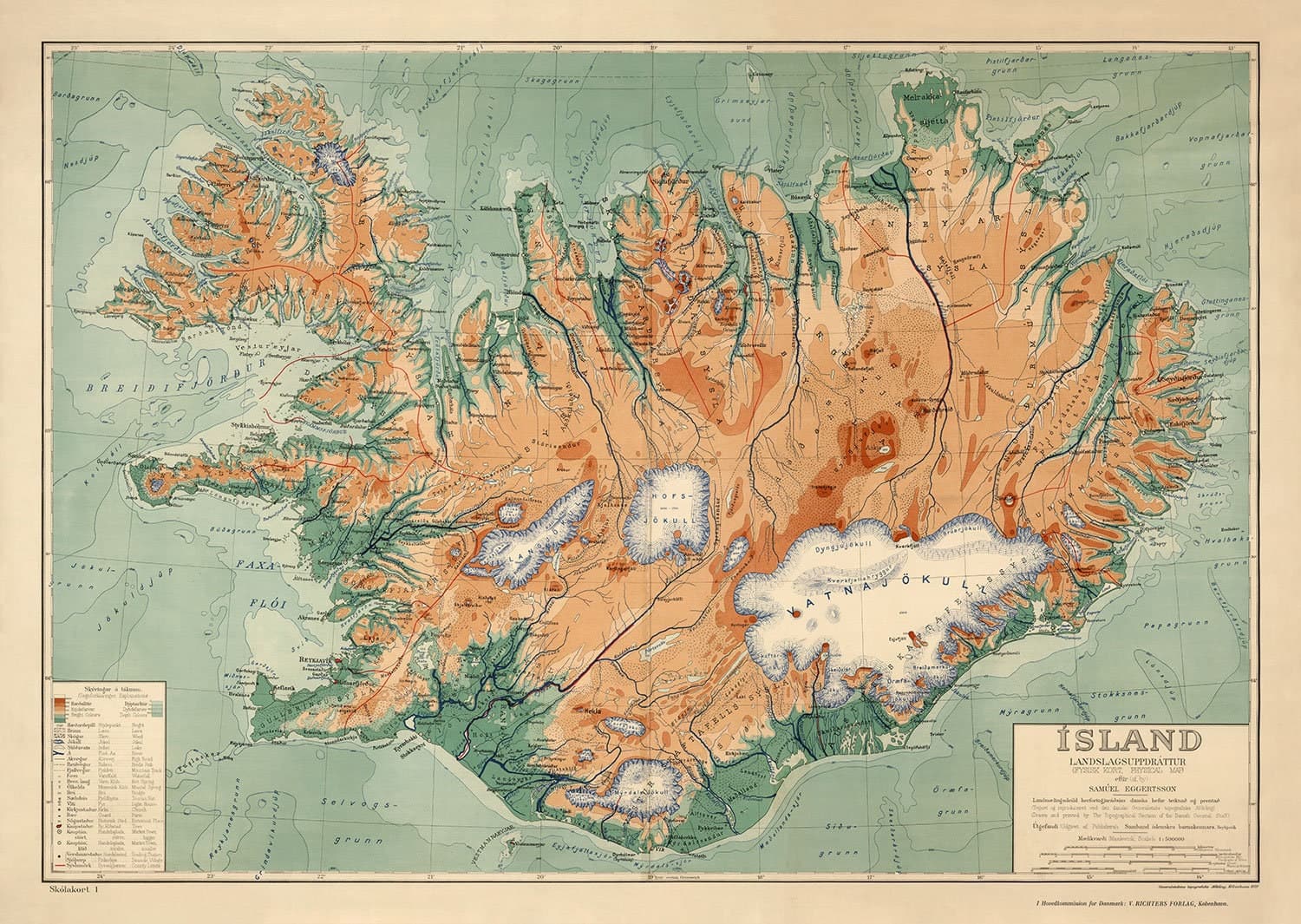 Alte Karte von Island von Samuel Eggertsson, 1928: Reykjavik, Keflavik, Geysir, Gulfoss, Vulkane, Gletscher