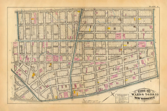 Diese exquisite handkolorierte lithografierte Karte aus dem Jahr 1879, die Teile der Bezirke 5, 6, 8 und 14 zeigt, bietet einen fesselnden Schnappschuss der geschichtsträchtigen Vergangenheit von Lower Manhattan. Diese von GW Bromley mit viel Liebe zum Detail erstellte Karte ist nicht nur ein Navigationsgerät, sondern ein historisches Artefakt, das New York City in einer Ära des Wandels einfängt. Die Lebendigkeit dieser Karte wird durch die sorgfältige Handkolorierung verstärkt, die verschiedene Merkmale mit bemerkenswerter Klarheit hervorhebt.