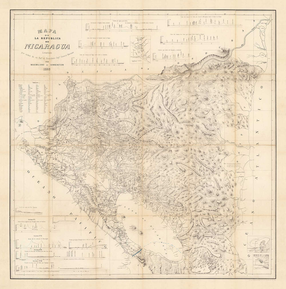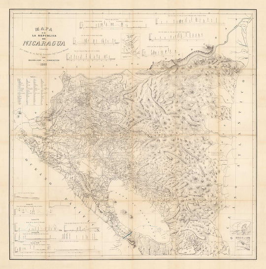 Es war Anfang des 19. Jahrhunderts, etwa 40 Jahre bevor diese Karte veröffentlicht wurde, als Nicaragua die Unabhängigkeit erlangte und sich den neu gegründeten Vereinigten Provinzen von Mittelamerika anschloss. Diese Karte zeigt alle Informationen, die sie in dieser Zeit gesammelt hatten, mit Tabellen rund um die Karte, einschließlich der Höhen von Bergen, Städten, Dörfern und Eisenbahnen.