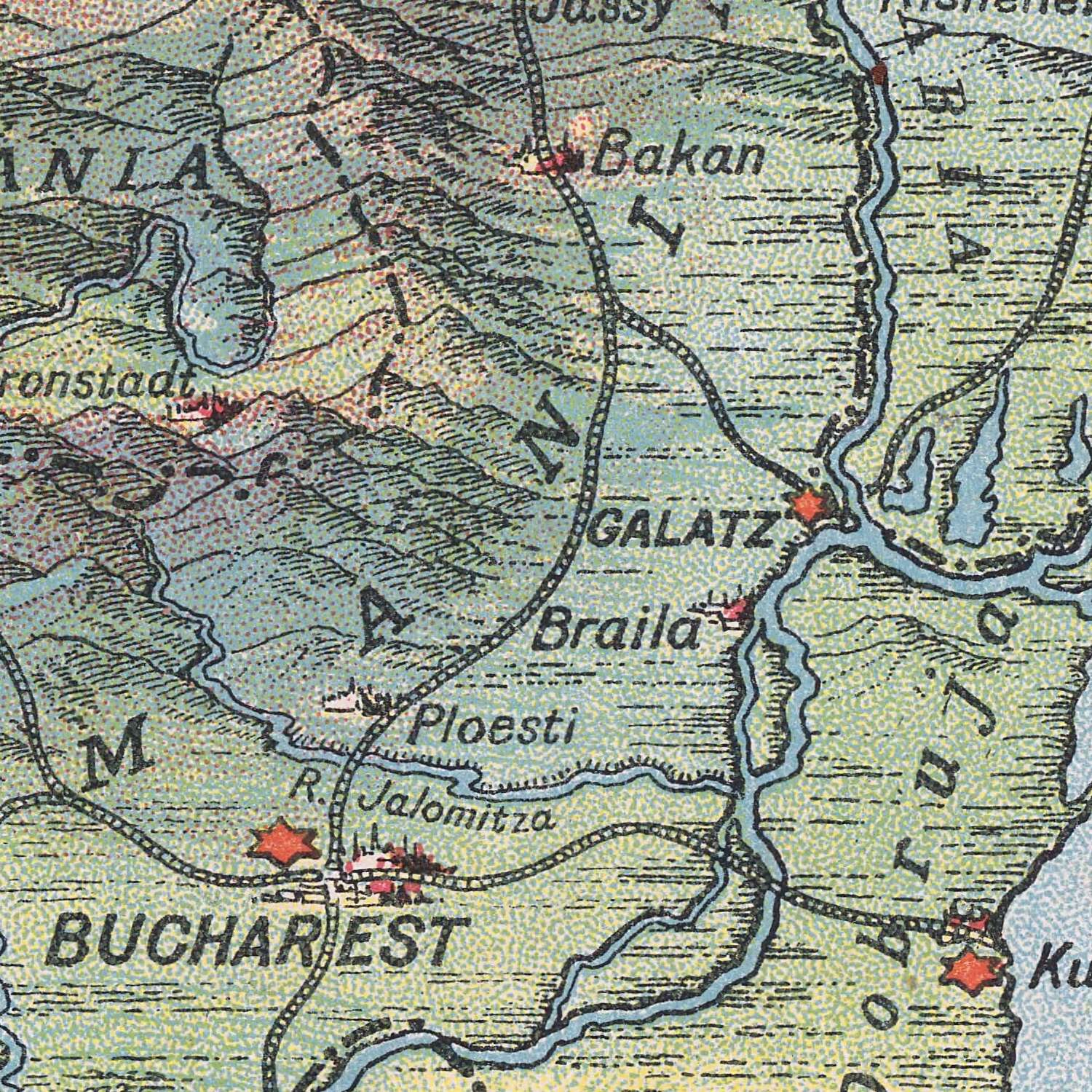 Amid the Great War, the map’s military resonance is unmistakable. Transport routes trace the Morava–Vardar corridor from Belgrade through Skopje to Thessaloniki—an artery that became the Allied Salonika Front. The Danube, marked with cities like Rustchuk and Galatz, reads as a supply lifeline and invasion frontier. Fort symbols and coastal defenses at Cattaro hint at Adriatic naval strategy, while Corfu’s prominence evokes Serbia’s harrowing retreat across Albania and subsequent regrouping. Romania’s 1916 entry into the war lends urgency to the rail spines linking Bucharest to Trans-Danubian crossings. In the southeast, the approaches to Thrace recall the wider struggle over the straits, situating the region within the grand chessboard of European strategy.