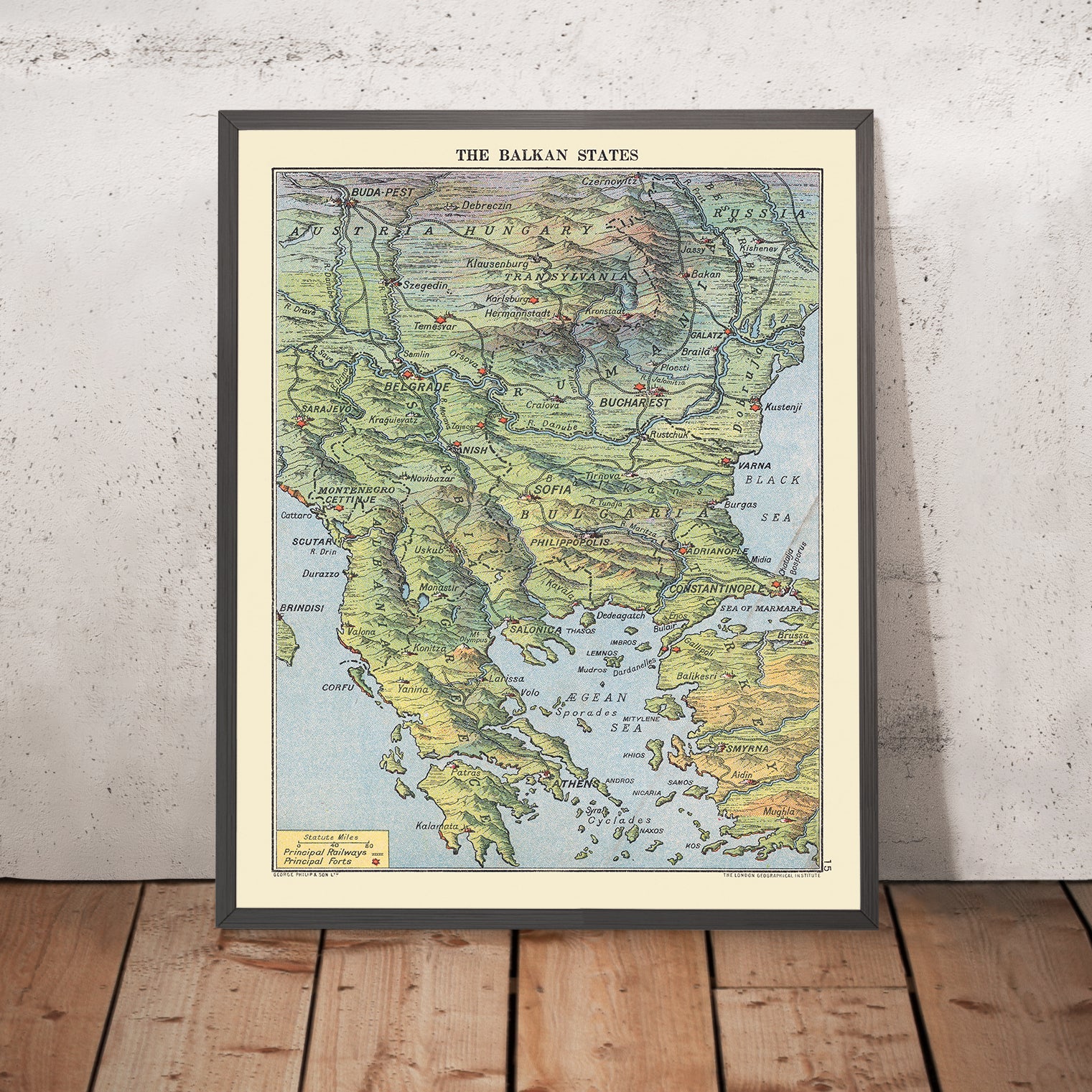 Created in 1916 by The London Geographical Institute, The Balkan States offers a masterful portrait of a region at the nexus of empires and national awakenings. Its vivid topography elevates mountains, river valleys, and coastlines into a coherent geometry of power and passage, while ornate lettering and careful symbology distinguish capitals and strategic towns. Political borders are crisply articulated against the physical landscape, inviting the viewer to read how terrain shaped diplomacy and ambition. Seen through this lens, the Balkans emerge not as a periphery but as the hinge of Europe—where the Danube converges with the Aegean and Adriatic, and where the nomenclature of cities—Athens, Belgrade, Sofia, Bucharest, and Constantinople—evokes centuries of shifting sovereignties.