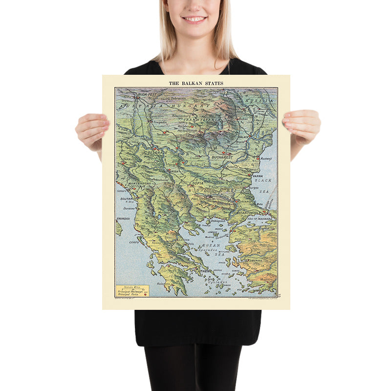 Economically and culturally, the cartography reveals the Balkans as a trading web fused to three seas. Varna and Galatz open to the Black Sea grain routes, Thessaloniki to the Levantine and Aegean trade, and Durazzo and Cattaro to Adriatic circuits that tie the peninsula to Buda-Pest and Central Europe. The careful plotting of lines of rail and road suggests how commerce, migration, and ideas moved along the same paths as armies. Mountain ranges—from the Balkan Mountains to uplands guiding river courses—explain why cities like Sofia, Skopje, and Plovdiv emerged where they did. The symbology marking Athens, Belgrade, Sarajevo, and Tirana testifies to a mosaic of identities knitted together by geography as much as by history.