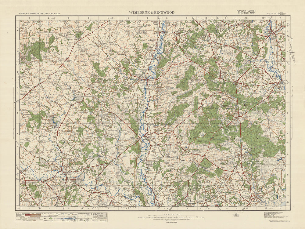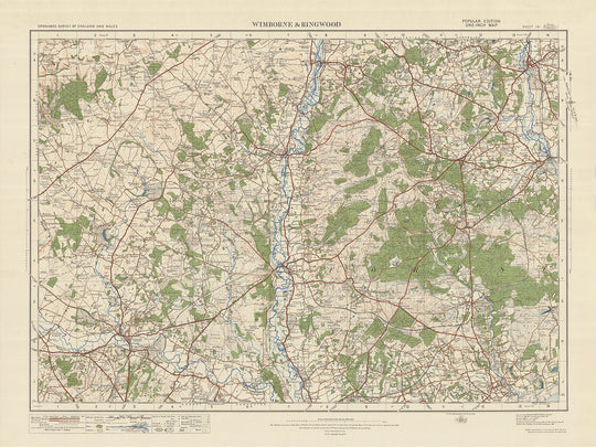 Diese Vintage-Karte mit dem Titel „Blatt 131 – Wimborne & Ringwood“ ist Teil der 1 Zoll großen „Popular“-Ausgabe des Ordnance Survey von England und Wales, die 1925 veröffentlicht wurde. Die Karte zeigt die Städte Wimborne & Ringwood sowie mehrere andere faszinierende Siedlungen und Wahrzeichen. Es bietet einen einzigartigen Einblick in die Vergangenheit und ermöglicht es Ihnen, die Region so zu erkunden, wie sie vor fast einem Jahrhundert war.