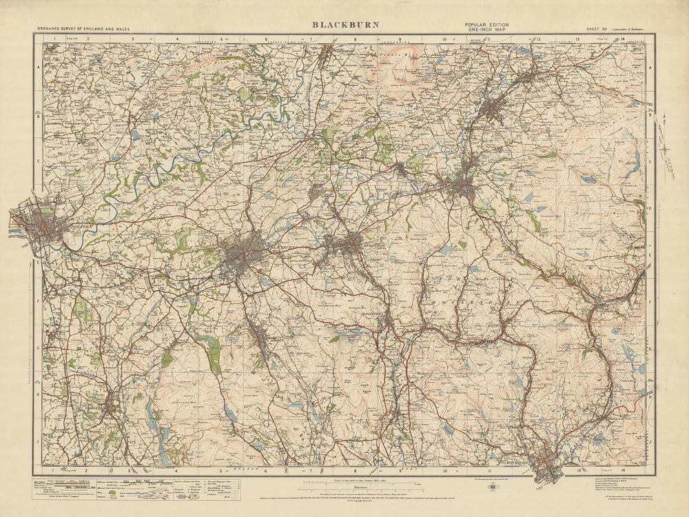 Diese alte Ordnance Survey Karte, Blatt 30 - Blackburn, 1925, ist ein faszinierendes historisches Dokument, das einen Einblick in die Vergangenheit von England und Wales bietet. Diese Karte wurde 1925 veröffentlicht und ist Teil der Ein-Zoll-"Popular"-Ausgabe von Ordnance Survey. Sie deckt ein Gebiet ab, das neben Blackburn selbst mehrere bedeutende Städte wie Preston, Burnley, Clitheroe, Accrington und Chorley umfasst.