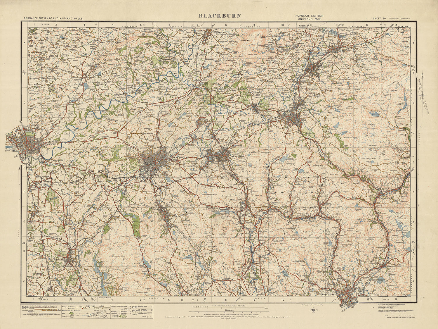 Alter Ordnance Survey Karte, Blatt 30: Blackburn, 1925: Preston, Burnley, Clitheroe, Accrington, Chorley