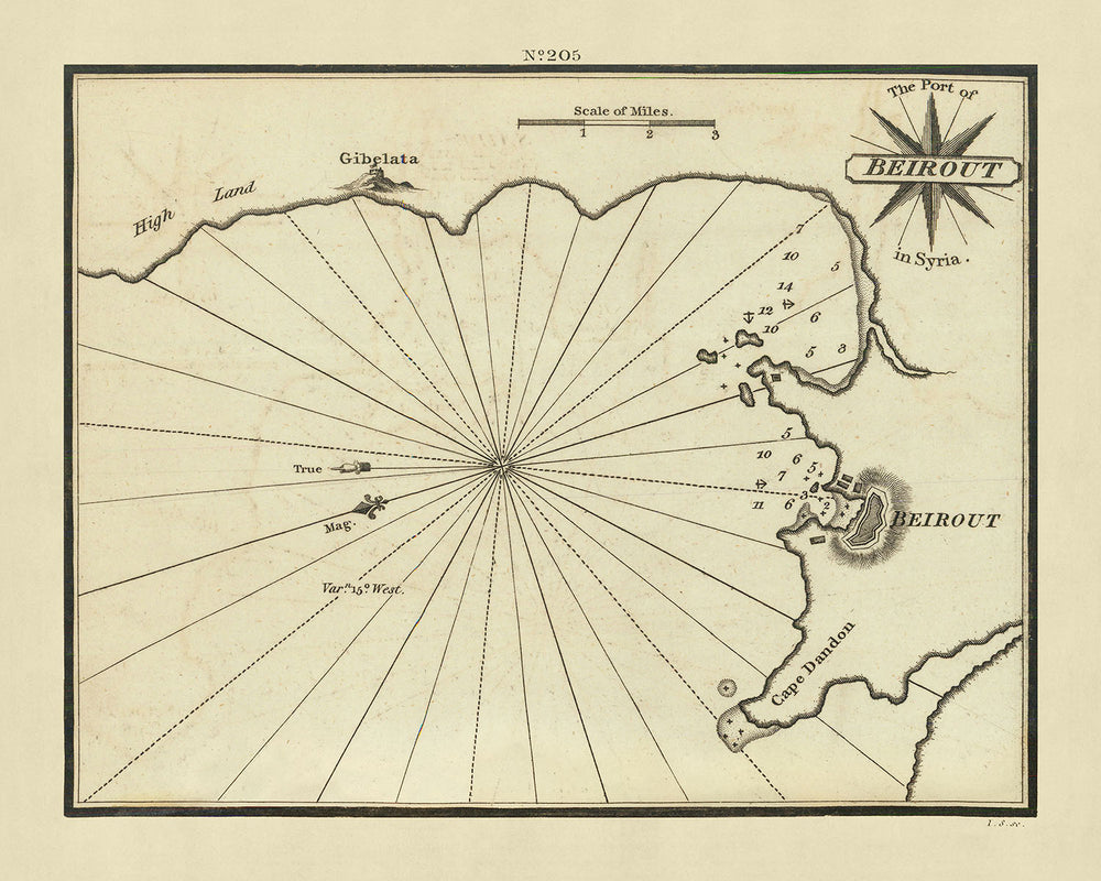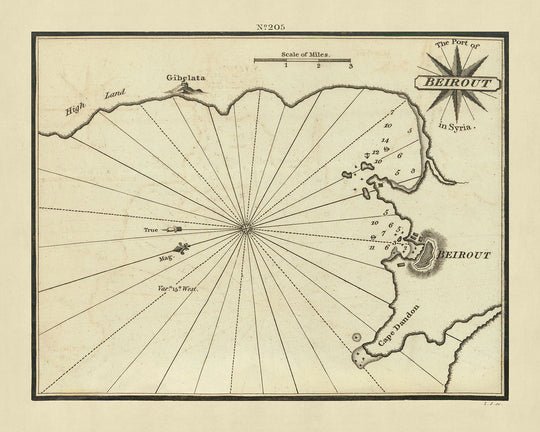 Die Karte offenbart komplexe Details über den Hafen von Beirut und bietet Tiefenangaben und Navigationshilfen, die die Komplexität des maritimen Reisens und Handels in dieser Zeit hervorheben. Diese Merkmale waren entscheidend für Seeleute, die durch die tückischen Gewässer des Mittelmeers navigierten, da sie ihnen essentielle Informationen lieferten, um den geschäftigen Hafen sicher zu erreichen. Die Einbeziehung solch detaillierter maritimer Daten spiegelt die bedeutende Rolle wider, die Beirut als maritimes Zentrum spielte, und veranschaulicht die breiteren geopolitischen und wirtschaftlichen Kontexte der Mittelmeerregion zu Beginn des 19. Jahrhunderts.