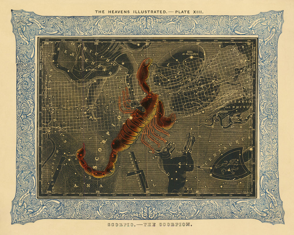 Duncan Bradford war ein bedeutender Verleger im Amerika des 19. Jahrhunderts, wobei „Die Wunder des Himmels“ eines seiner bemerkenswerten Werke war. Sein Werk erreichte ein breites Publikum mit seiner zugänglichen, aber umfassenden Behandlung der Astronomie. Dieser spezielle Atlas des Skorpions hebt sich nicht nur durch seinen historischen Wert ab, sondern auch durch seinen fesselnden künstlerischen Eindruck, bei dem die Sternpositionen schön detailliert und gegen den subtil handkolorierten Hintergrund kontrastiert sind.