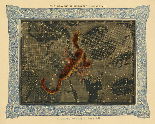 Die Himmelskarte des Skorpions strahlt mit komplexen Details und lebendiger Farbgebung, die das Wesen des Nachthimmels auf eine Weise einfängt, die sowohl wissenschaftlich als auch künstlerisch ist. Sie verkörpert die Vereinigung von Kunst und Wissenschaft, wie sie in Bradfords Werk zu sehen ist, und macht es zu einem zeitlosen Stück für Sternengucker und Kunstliebhaber gleichermaßen. Die Kombination aus präzisen astronomischen Daten und zarter Handkolorierung macht dieses Stück zu einer aufregenden Ergänzung jeder Sammlung.