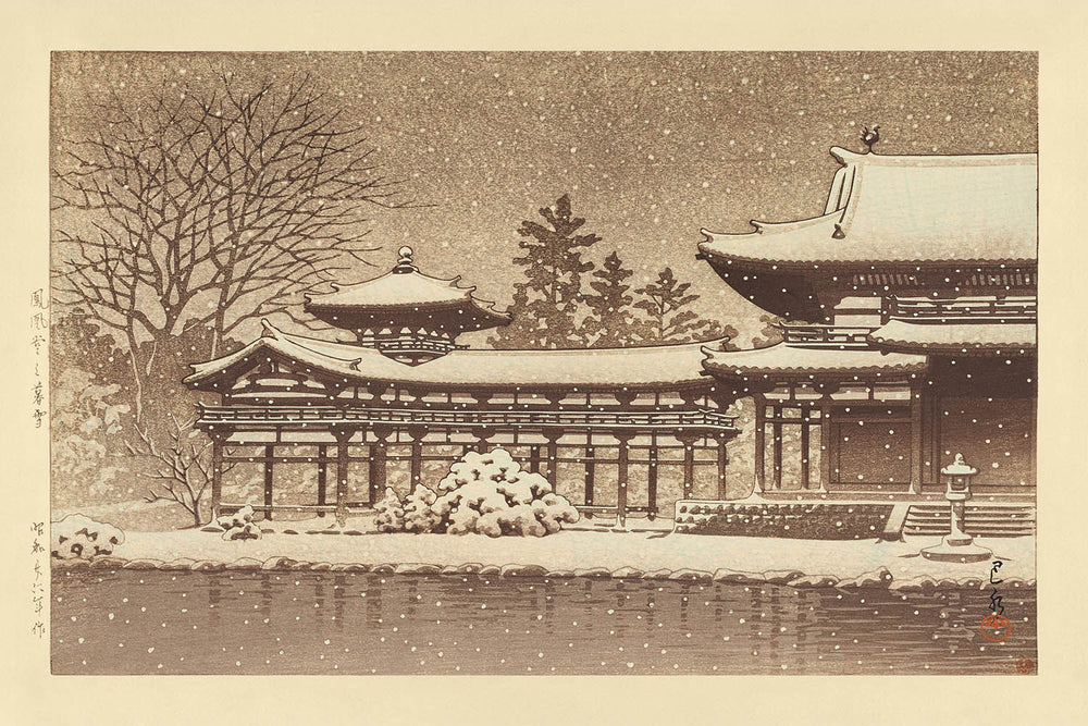 Hasui Kawase es celebrado como una figura clave en el movimiento Shin-Hanga, que buscaba dar nueva vida a la impresión tradicional en madera incorporando elementos modernos. Su trabajo se caracteriza por escenas de quietud y sutil juego de luz, que invitan a los espectadores a momentos íntimos de paz y contemplación. "Nieve de Noche en el Templo Byodoin" o "平等院の夕雪" (Byodoin no Yuki) se erige como una pieza seminal, capturando la interacción de la nieve que cae contra el templo histórico, con un uso sofisticado de una paleta de colores restringida de marrones, blancos y parches de amarillos cálidos que dan un sutil resplandor contra la tranquila nieve.