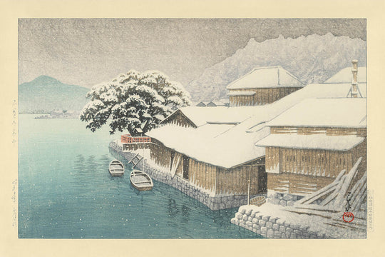 La Nieve de Noche en Ishinomaki de Hasui Kawase sumerge al espectador en la serena belleza de una noche de invierno en Japón. Creada en 1935, esta exquisita impresión en madera del reverenciado movimiento shin-hanga de Japón captura la tranquilidad y la sutil complejidad de los paisajes cubiertos de nieve, un tema recurrente en la aclamada obra de Hasui Kawase. El título japonés original, 石巻の暮雪 (Ishinomaki no Bosetsu), refleja el encantador silencio de esta ciudad costera bajo una suave nevada.
