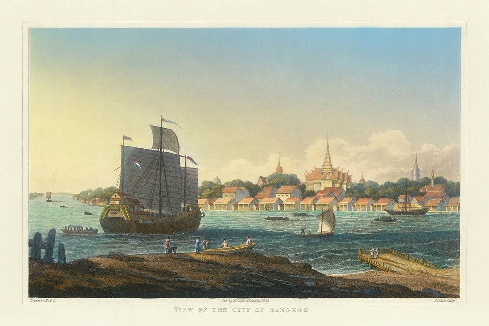 Henry Colburn fue un destacado editor británico, conocido por curar y poner a disposición obras de interés histórico y cultural significativo. Aunque el artista específico acreditado por esta vista está listado como H.A.C. —una figura misteriosa cuya identidad sigue siendo incierta— la combinación de la destreza de dibujo de primera mano y el refinado proceso de acuarela de John Heaviside Clark resulta en una instantánea convincente de Bangkok en el siglo XIX. A través de la publicación de Colburn, este mundo raramente visto fue presentado a una amplia audiencia europea por primera vez.