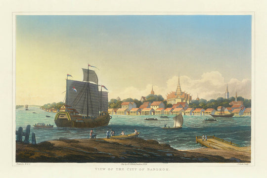 La Primera Vista de Bangkok de Henry Colburn es una perspectiva verdaderamente histórica, capturando la primera vista impresa de la ciudad tal como se veía desde el río Chao Phraya en 1828. Esta evocadora acuarela antigua se basó en bocetos tomados en persona durante la misión diplomática de John Crawfurd a las cortes reales de Siam a principios de la década de 1820. Con una exquisita atención tanto a la forma arquitectónica como a la vitalidad de la vida ribereña, la obra de arte transporta a los espectadores al corazón del viejo Bangkok, mirando a través del agua hacia lo que ahora es el bullicioso barrio chino.