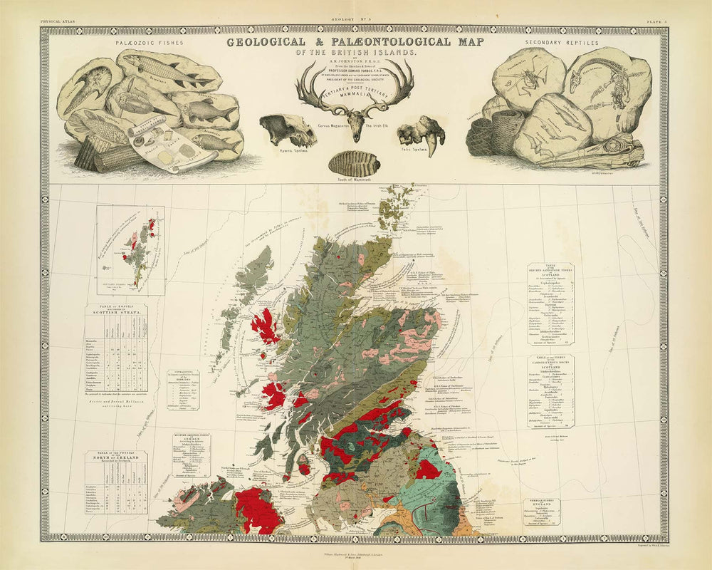 Este es un mapa bastante inusual de las regiones geológicas (rocas) y paleontológicas (fósiles) de Escocia. Lo que es aún más inusual es que fue creado hace mucho tiempo, en 1854, grabado por A.K. Johnston a partir de las notas y grabaciones de Edward Forbes.