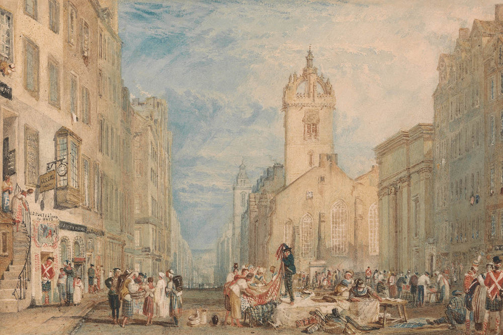 Turner, conocido por su magistral uso de la luz, revolucionó la pintura en acuarela británica con su asombrosa habilidad y trabajo cargado de emoción. "High Street, Edimburgo" es un ejemplo notable de su capacidad para combinar precisión arquitectónica con efectos atmosféricos, ilustrando por qué fue una figura clave en el movimiento romántico. La pintura muestra la fascinación de Turner por capturar tanto la grandeza como las sutilezas del entorno natural y los paisajes urbanos.
