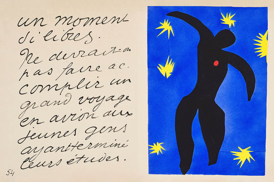 "Ícaro" de Matisse es un testimonio notable de su capacidad para evocar emoción a través de la simplicidad del diseño. La obra de arte representa magistralmente la figura mitológica de Ícaro, suspendido en un cielo cobalto, con explosiones contrastantes de estrellas amarillas y contornos negros que transmiten tanto la gravedad como el vuelo del espíritu humano. El uso audaz del color y las formas fluidas de Matisse marcan la profundidad de esta exuberante obra.