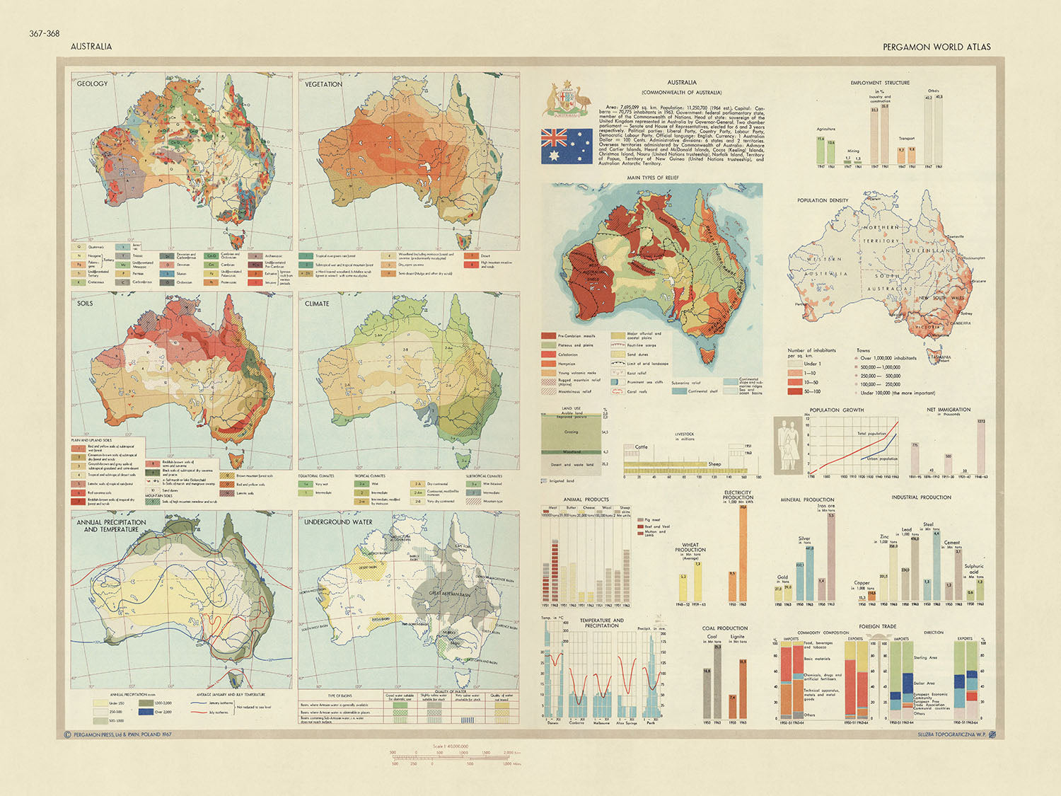 - Publicado en 1967, el mapa captura el estado socioeconómico y ambiental de Australia durante un período de crecimiento y desarrollo significativos.