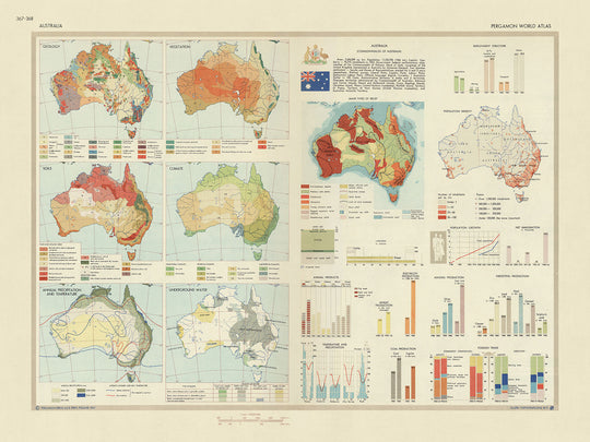 Antigua infografía del mapa de Australia, 1967: Agricultura, Geología, Empleo, Clima, Aguas subterráneas, Comercio exterior