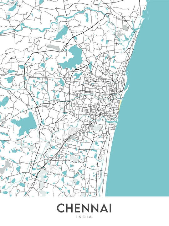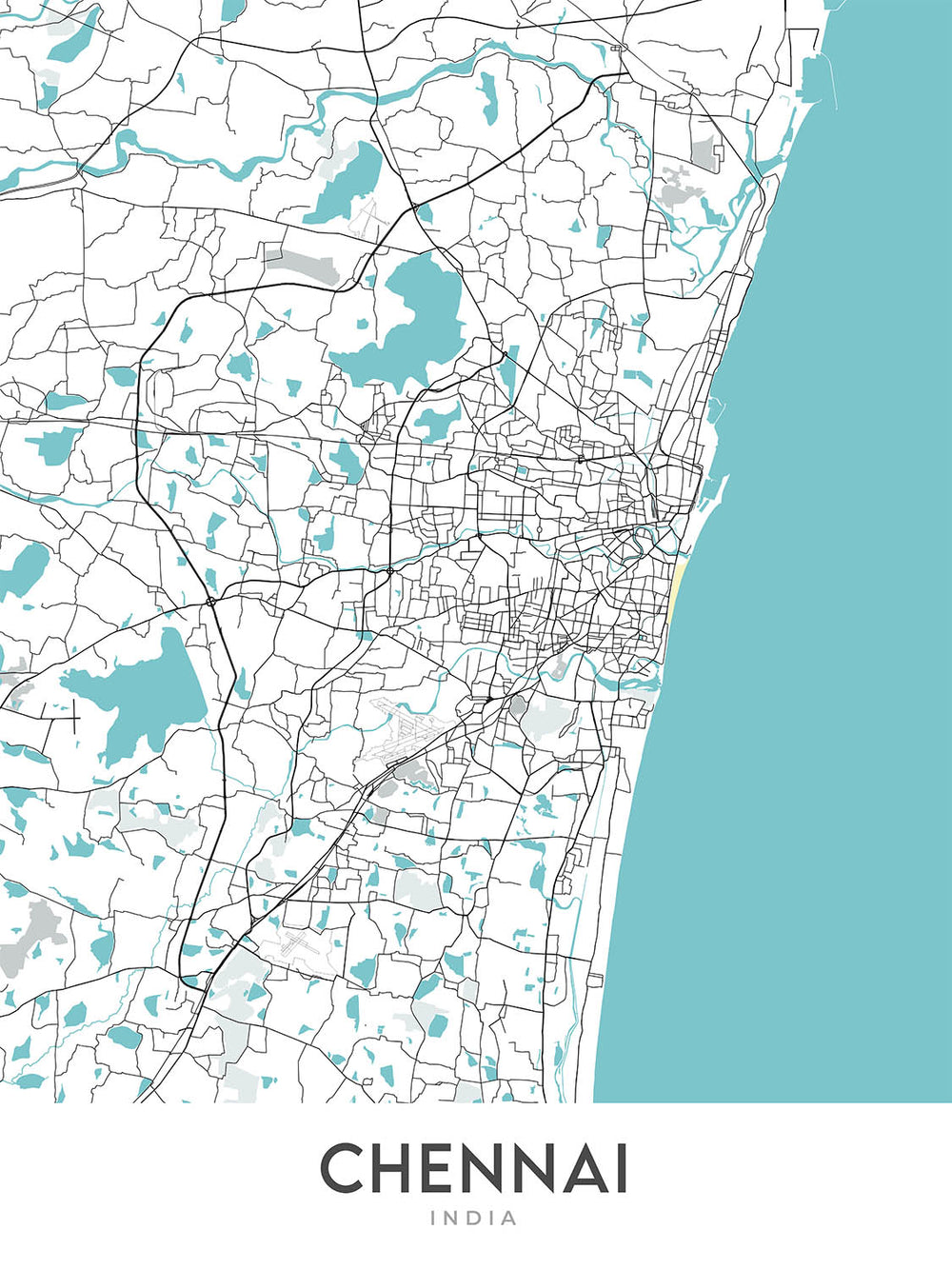 Más allá de su atractivo visual, este mapa resume el espíritu dinámico de Chennai. Destacando áreas clave como el centro educativo de Guindy, la riqueza histórica de Fort St. George y la belleza natural de Marina Beach, trae los puntos emblemáticos de la ciudad a su hogar. La descripción detallada del mapa de los ríos de Chennai, como el Cooum y el Adyar, y su línea costera a lo largo de la Bahía de Bengala, añade un encanto geográfico que combina a la perfección con el diseño urbano.
