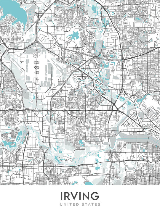 Este mapa de Irving, Texas, es un callejero moderno y detallado sin etiquetas. El mapa se centra en la ciudad de Irving y sus alrededores, proporcionando una representación precisa y visualmente atractiva del diseño de la ciudad. El mapa cubre una amplia gama de vecindarios, incluidos Las Colinas, Valley Ranch, West Irving, Irving Mall, Heritage, Plymouth Park, Oak Creek, Cottonwood Heights, Hidden Cove y The Trails of Williams.