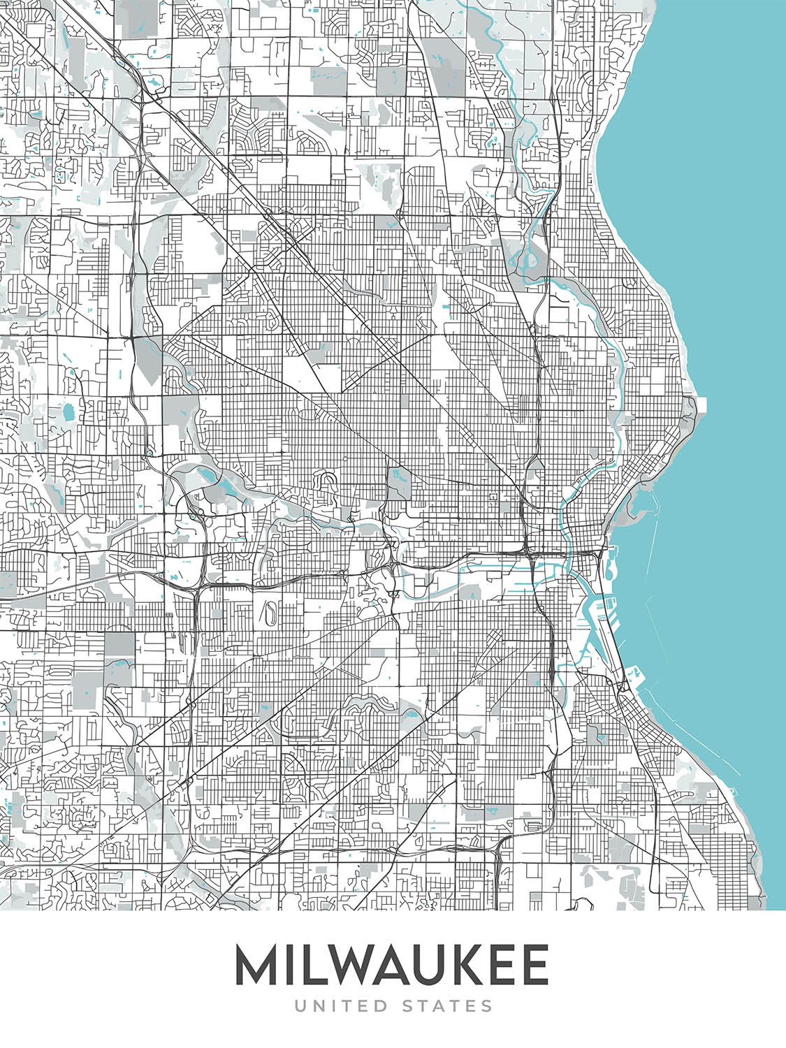 Este mapa de Milwaukee, Wisconsin, es una obra cartográfica moderna y detallada que se centra en el diseño de las calles de la ciudad sin la distracción de etiquetas. El mapa cubre un área rectangular que se extiende desde el vecindario de Bay View en el sur hasta el zoológico del condado de Milwaukee en el oeste, y desde el valle de Menomonee en el este hasta el aeropuerto internacional Mitchell en el sur. El área del centro de la ciudad, incluidos los vecindarios del Historic Third Ward, Westown y East Town, se presenta de manera prominente en el centro del mapa.