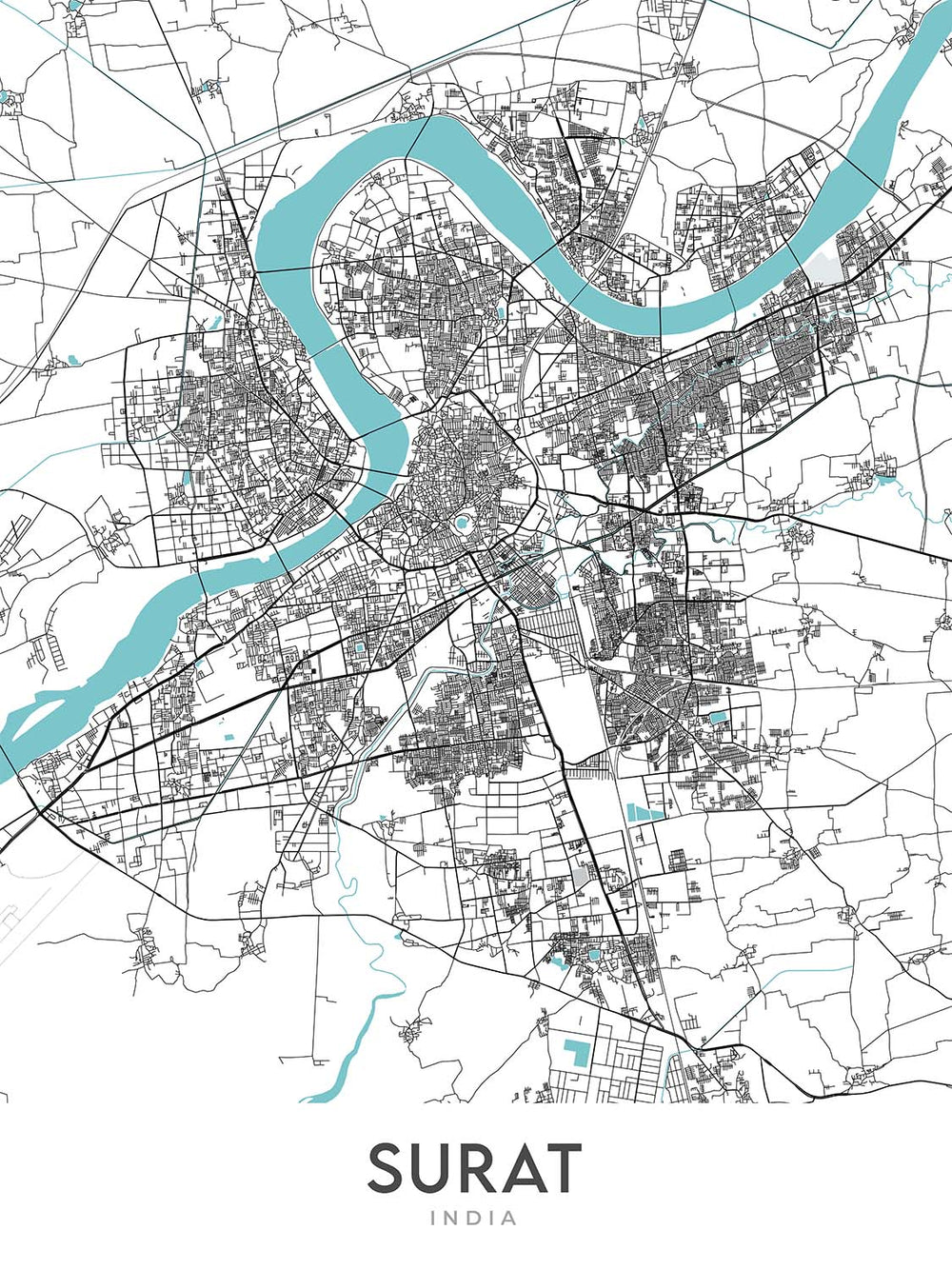 Las áreas cubiertas por este mapa incluyen algunos de los lugares más emblemáticos de Surat, como el sereno río Tapi, el exuberante Parque Natural Sarthana y el histórico Jardín Holandés. Cada uno de estos puntos de referencia está representado con un estilo artístico que resalta su importancia sin abrumar al espectador. El diseño del mapa llama sutilmente la atención sobre estas características, lo que lo convierte en un agradable tema de conversación para cualquiera que esté familiarizado con el patrimonio cultural y natural de Surat.