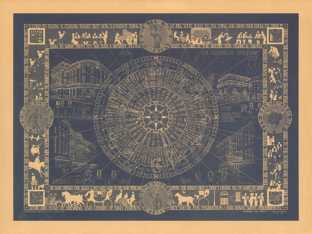 "El CÓMO, CUÁNDO y DÓNDE de la Bebida Discriminatoria y Placentera" de Collins C Diboll, publicado por primera vez en 1931, ofrece un argumento visual ingenioso y elegante sobre la importancia histórica del alcohol en la cultura local, incluso en medio de la era de la prohibición. Esta litografía antigua a color está anclada en la ciudad de Nueva Orleans con su larga historia cultural de comida y bebida. En la imagen se encuentra un reloj central rodeado de cuatro bares famosos, ilustrando que no importa la hora del día o de la noche, una bebida específica, completa con su receta, está lista para cualquier momento. Acompañada de viñetas que representan la cena, el deporte y la vida nocturna de la era del jazz, la impresión incluye citas que encapsulan el espíritu de la época, como "Comamos, Bebamos y Alegrémonos-Gastemos nuestros centavos-Porque no podemos usarlo dentro de 100 años."