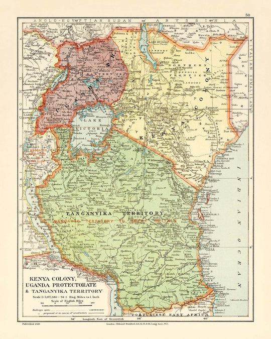 - Depicts regions corresponding to present-day Kenya, Uganda, Rwanda, and Tanzania (historically Kenya Colony, Uganda Protectorate, and Tanganyika Territory)