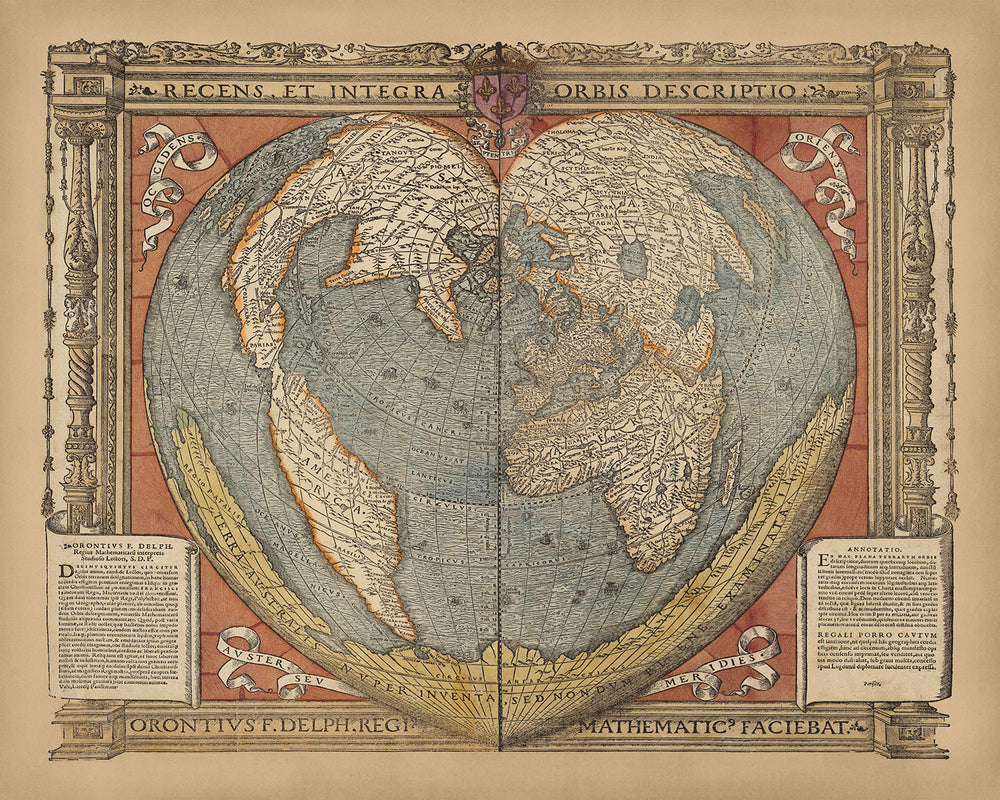 El diseño en forma de corazón del mapa, conocido como proyección cordiforme, es estéticamente agradable y científicamente significativo. Esta innovadora proyección se inspiró en el geógrafo Ptolomeo del siglo II y luego fue codificada por Johannes Werner en 1514. La forma del corazón simboliza el mundo como una entidad viviente, lo que refleja el espíritu humanista del Renacimiento. El uso que hace Fine de esta proyección muestra su destreza matemática y su capacidad para combinar el arte con la ciencia, creando un mapa que es tan hermoso como informativo.