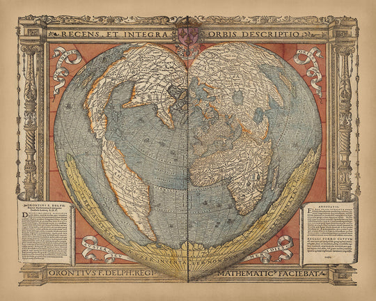 Antigua Mapa Mundial en Forma de Corazón por Fine, 1534: Proyección Cordiforme, Terra Australis, Anotaciones en Latín