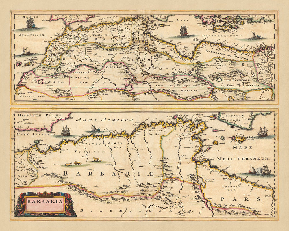 El mapa 'Barbaria' muestra la belleza de la cartografía y el arte de sus creadores. Cada mapa grabado a mano en la hoja sirve como testimonio de la habilidad y la atención al detalle del cartógrafo. Cubre el norte de África y el Mediterráneo; el panel superior muestra casi toda la costa norte de África y el panel inferior proporciona una descripción detallada del área en las cercanías de la actual Argel. El mapa muestra fronteras políticas, ciudades, pueblos, vías fluviales, canales, puntos de referencia, vida silvestre y montañas, todo ello cobra vida a través del cartel decorativo del título y el relieve pictórico.