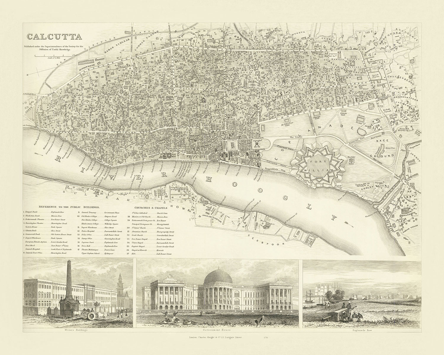 Mapa antiguo de Calcuta (Kolkata), 1840: Fuerte William, Casa de Gobierno, Esplanade Row, Maidan, Puente Howrah