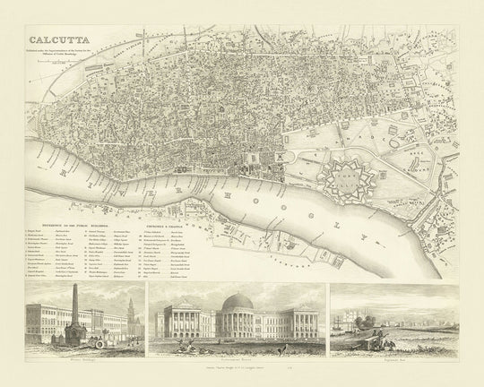 Este mapa de 1840 de Calcuta (Kolkata), India, es un mapa de la ciudad detallado e informativo que ofrece un vistazo al pasado de la ciudad. El mapa cubre una gran área, incluyendo el centro de la ciudad, el área del puerto y los suburbios circundantes. Es un documento fascinante que ofrece información sobre la historia, geografía y arquitectura de la ciudad.