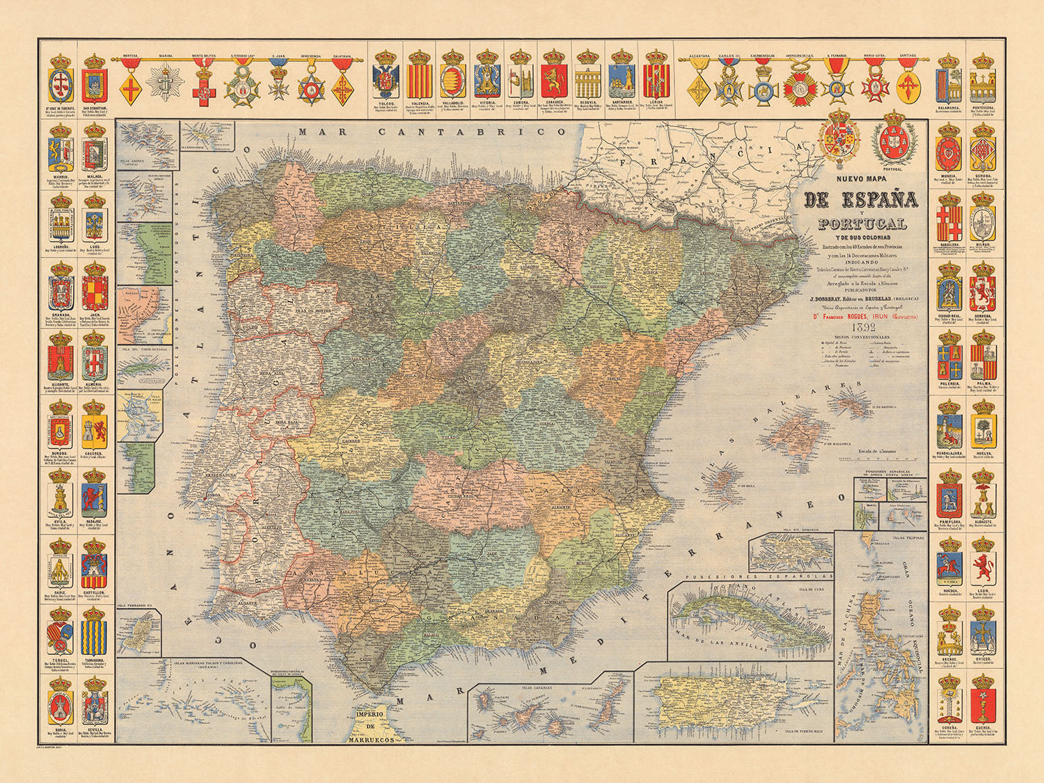 Mapa antiguo de España y Portugal de Dosseray, 1892: Imperios, Colonias, Puerto Rico, Filipinas, Cuba