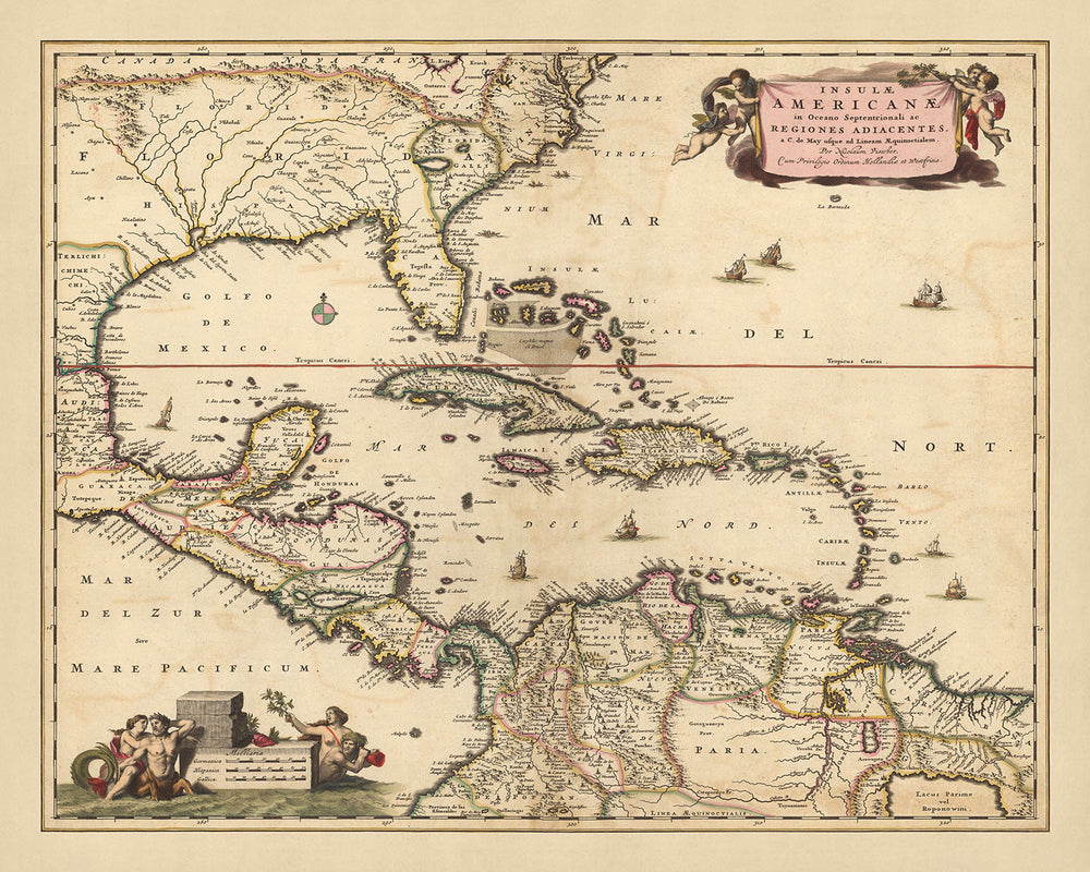 La atención de Visscher al detalle es evidente en la representación del mapa de ciudades y puntos de referencia importantes. Los territorios de Luisiana, Texas y Georgia están bellamente delineados, junto con la Península de Yucatán y el enigmático Triángulo de las Bermudas. Estos lugares, cada uno con su propia rica historia y significado cultural, cobran vida a través del meticuloso grabado del mapa. Este mapa sirve no sólo como guía geográfica sino también como una ventana al pasado, que ofrece una visión del paisaje geopolítico de la época.