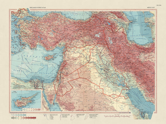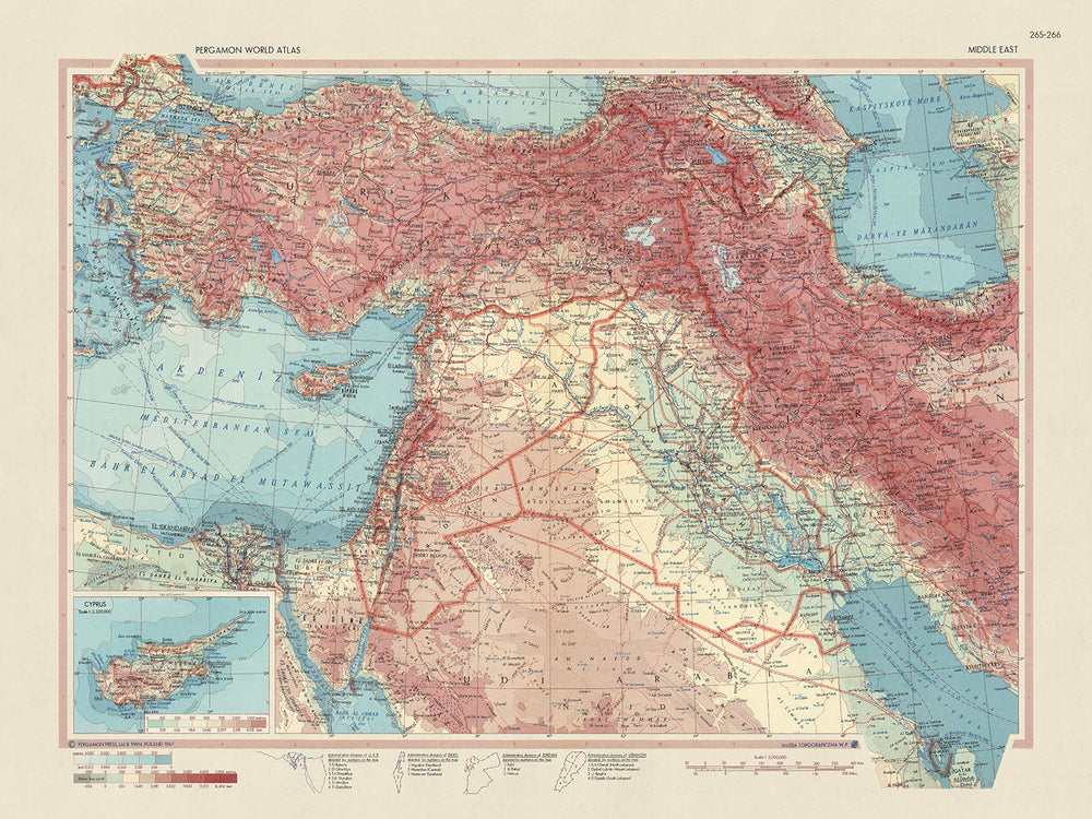 La atención al detalle del mapa es especialmente evidente en su representación de Turquía, Irak, Irán, Jordania e Israel. La delimitación de estos países, cada uno con su propia historia e identidad cultural únicas, subraya la diversidad de Medio Oriente. El mapa sirve como documento histórico y proporciona información sobre las fronteras políticas de la época. Su valor se extiende más allá de la mera geografía y ofrece una instantánea del panorama político de la región a finales de los años sesenta.