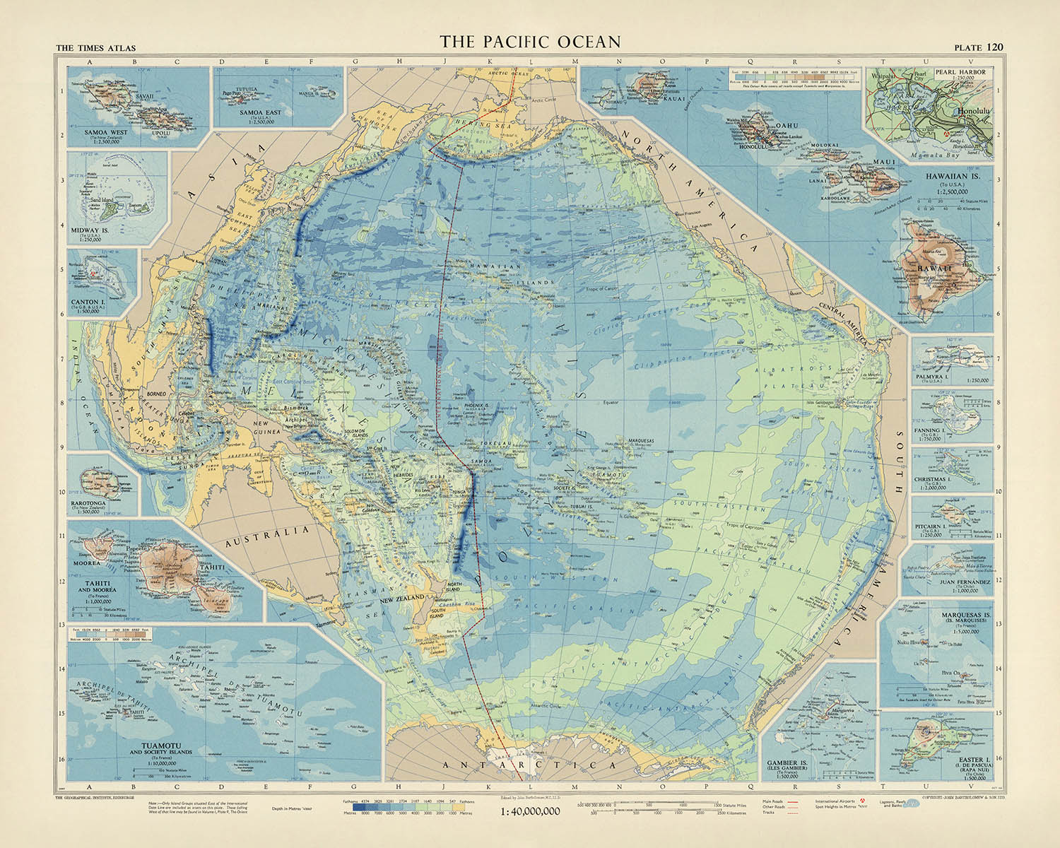 Antigua mapa del Océano Pacífico de Bartholomew, 1957: Mapas adicionales, sombreado de relieve