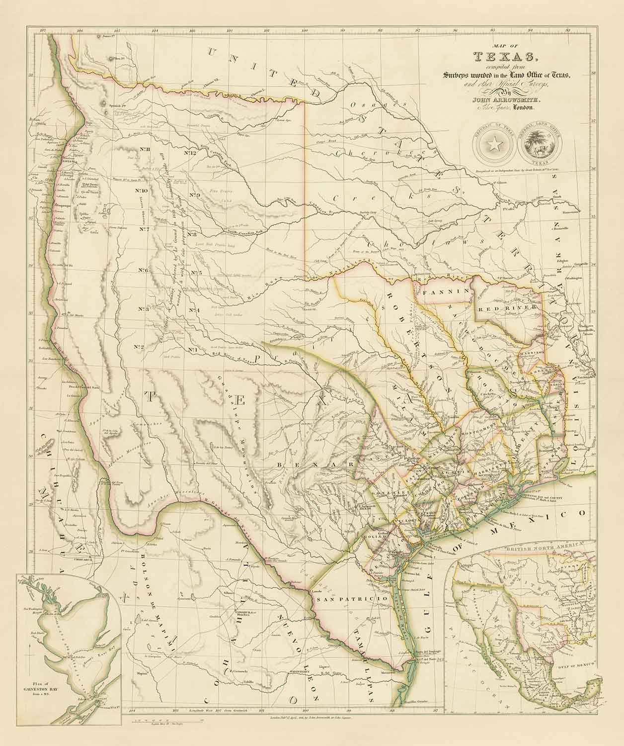 Un hermoso mapa de Texas, publicado originalmente en 1841 por probablemente el cartógrafo más buscado del mediado del siglo XIX, John Arrowsmith.
