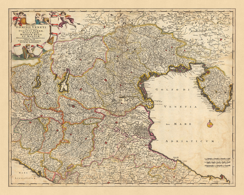 Sumérgete en el rico tapiz de la historia con este impresionante mapa, 'Accuratissima dominii Veneti in Italia, ducatus Parmae, Placentiae Modenae regii et Mantuae episcopatusq. Tridentini tabula quae est Lombardia Inferior.' Esto se traduce como "El mapa más preciso del dominio veneciano en Italia, los ducados de Parma, Piacenza, Módena, el reino de Mantua y el obispado de Trento, que es la Baja Lombardía". Elaborado por el estimado Nicolaes Visscher II en 1690, este mapa resume la grandeza y la complejidad del dominio veneciano en lo que hoy es la Italia moderna.