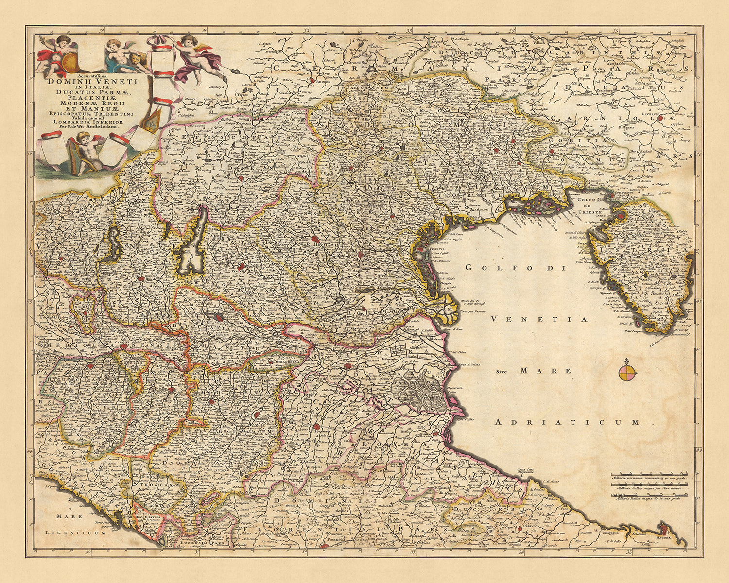 Antiguo mapa del dominio veneciano de Visscher, 1690: Bolonia, Florencia, Venecia, San Marino, Parco Alto Garda Bresciano