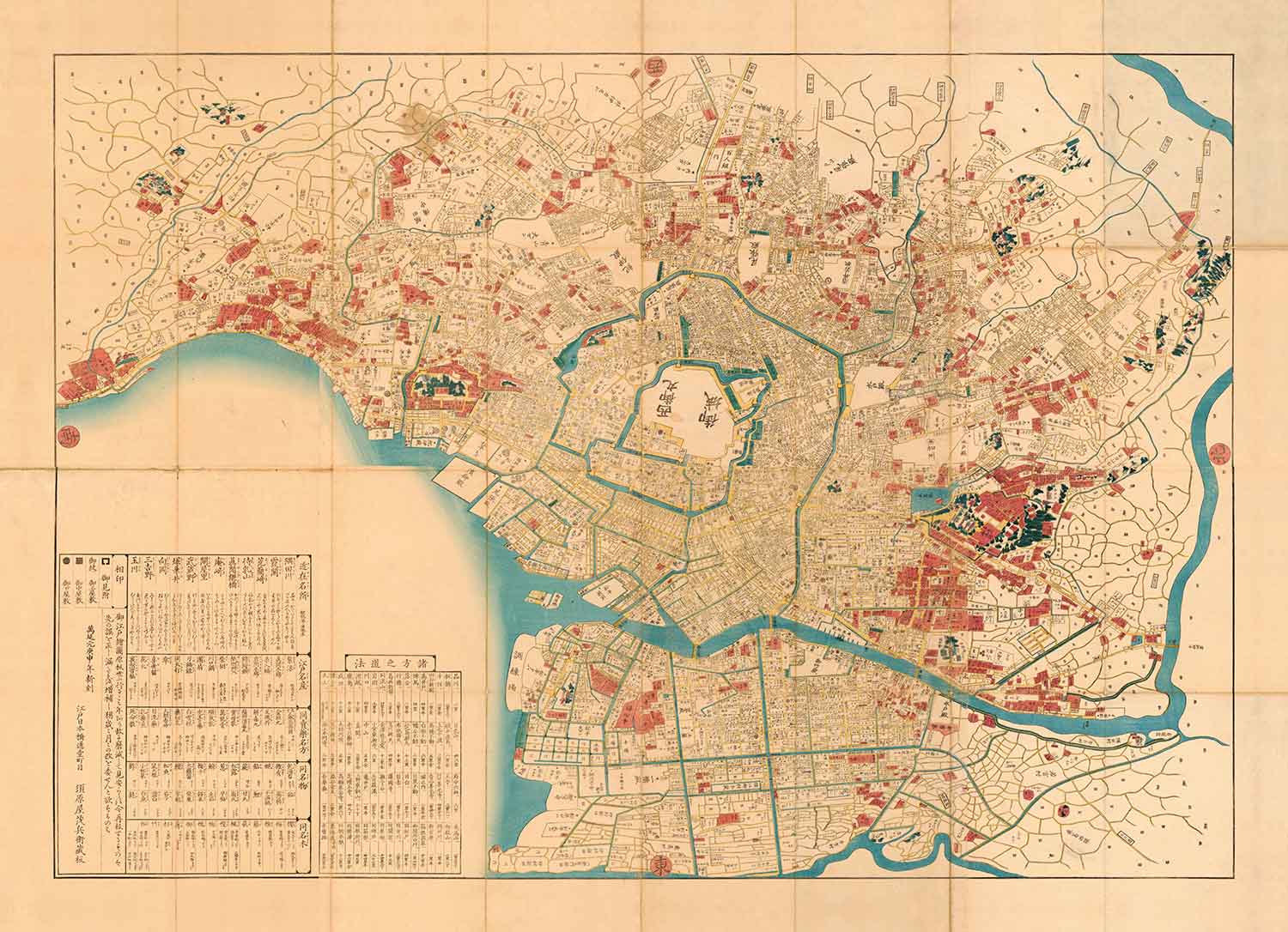 Tokio era conocido entonces como Edo. Cuando se publicó este mapa, Japón estaba gobernado por el shogunato Tokugawa, el gobierno militar que tenía su sede en Edo. Sin embargo, poco después de que se publicara este mapa, la era Edo terminó como resultado de la unión de dos poderosos clanes anti-Tokugawa para derrocar al shogunato.