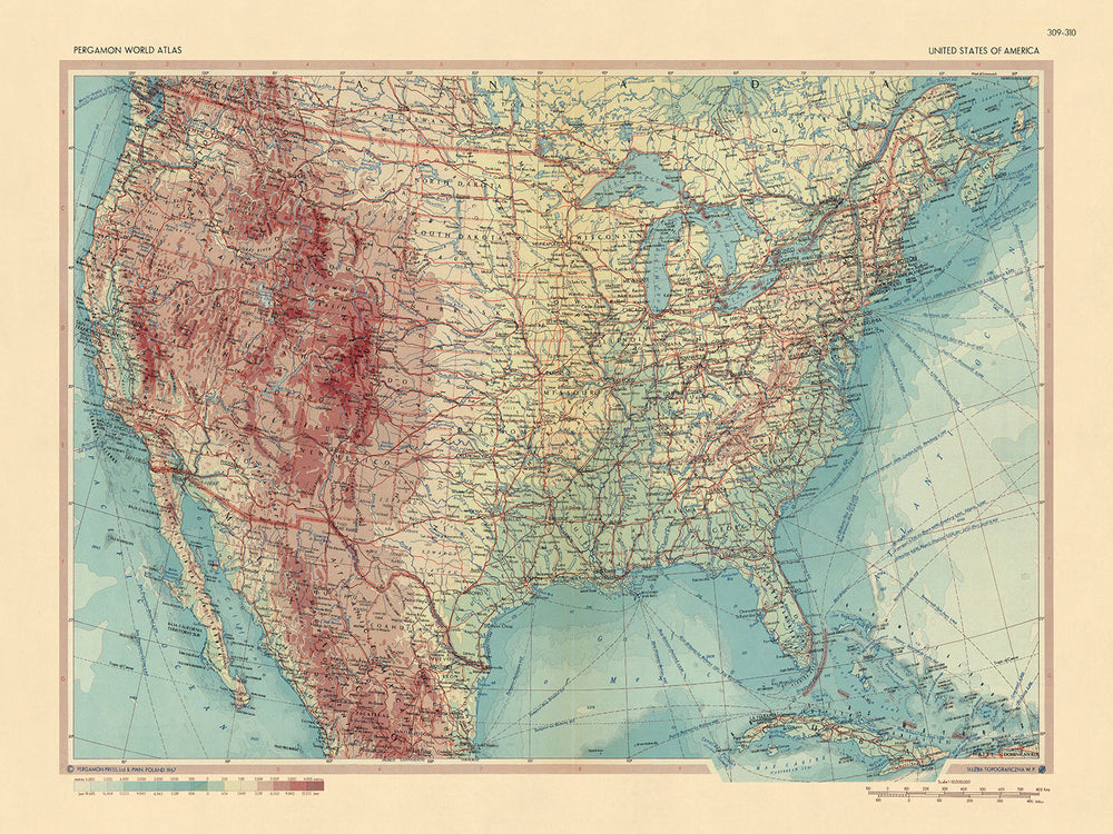 Finalmente, el creador del mapa, el Servicio de Topografía del Ejército Polaco, merece una mención especial. Conocido por su cartografía precisa y detallada, este mapa ejemplifica su compromiso con la exactitud y la calidad. El mapa de los 'Estados Unidos de América', con su representación política y física detallada, es un testimonio de su experiencia y destreza. La cobertura integral del mapa, combinada con su enfoque en regiones fronterizas significativas, lo convierte en un recurso valioso para aquellos interesados en la historia, geografía y geopolítica de América del Norte.