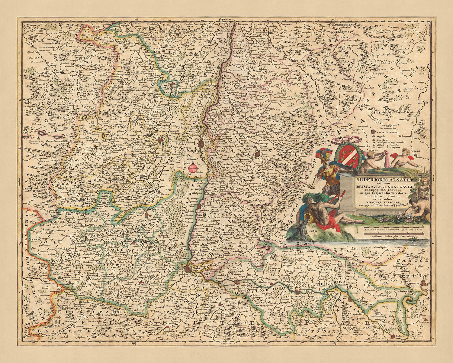 Mapa antiguo de la Alta Alsacia, Breisgau y Sundgau por Visscher, 1690: Basilea, Friburgo de Brisgovia, Colmar, Mulhouse, Jurapark Aargau