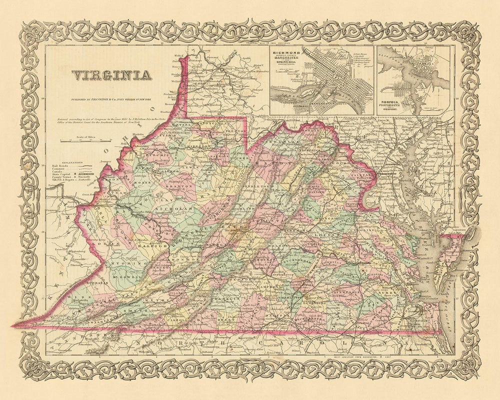 Sumérgete en la rica historia de los Estados Unidos con este exquisito mapa antiguo de Virginia, elaborado por el estimado cartógrafo JH Colton en 1859. Colton es universalmente reconocido como uno de los mejores cartógrafos estadounidenses de su época, y esta pieza es un testimonio de su maestría. Sus mapas son famosos por su precisión y detalle, y este mapa de Virginia no es una excepción.