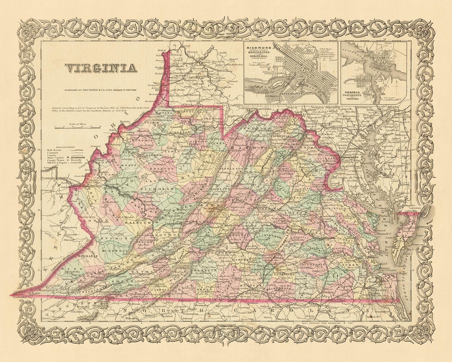 El mapa presenta los cinco asentamientos más notables de Virginia en 1855: Richmond, Alejandría, Norfolk, Lynchburg y Petersburgo. Cada uno de estos asentamientos tiene su propia y rica historia, y su representación en este mapa permite vislumbrar su pasado. Richmond, la capital de Virginia, ocupa un lugar destacado, junto con Alejandría, una ciudad conocida por su bullicioso puerto y su vibrante escena cultural. También se representan Norfolk, una base naval clave, Lynchburg, un importante centro de tabaco y manufactura, y Petersburgo, un importante centro de transporte.