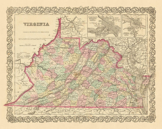 Este mapa captura una instantánea única de la historia de Virginia, en una época en la que Estados Unidos todavía estaba en su infancia. Muchos de los asentamientos que conocemos hoy aún no se habían fundado, y los nombres y fronteras que ahora nos resultan tan familiares todavía estaban cambiando. Este mapa sirve como una ventana fascinante al pasado, permitiéndonos ver cómo ha evolucionado el estado de Virginia durante los últimos 150 años.