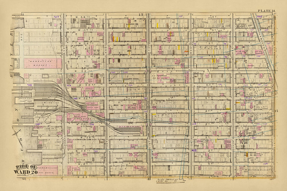 Mapa antiguo del distrito 20, Nueva York, 1879: Garment District, New York Central y Hudson River Freight Yard, Manhattan Market, Acuario de Nueva York