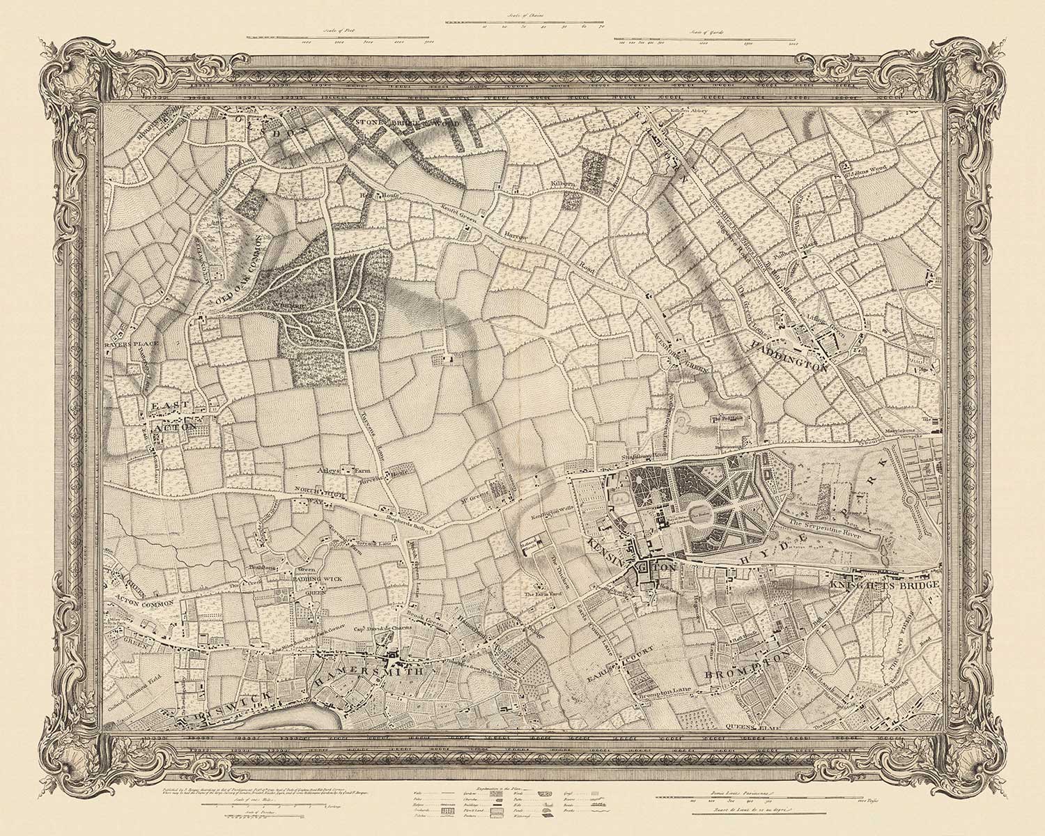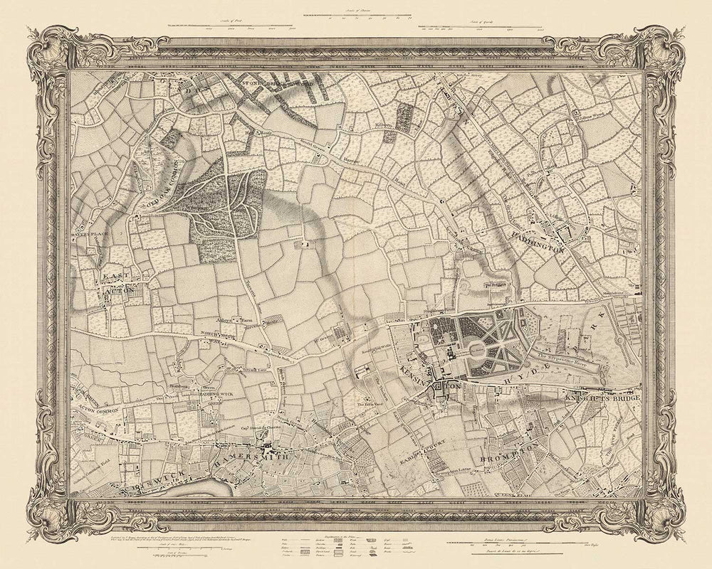 Antiguo mapa del oeste y centro de Londres en 1746 por John Rocque: Hamersmith, Kensington, Hyde Park, Knightsbridge, Shepherd's Bush, SW3,SW5, SW7, W2, W6, W10, W12, W14, NW8