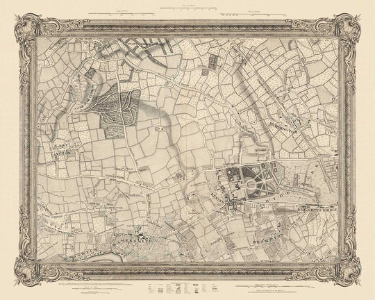 Publicado hace casi 300 años por el maestro cartógrafo John Rocque, este es el primer mapa detallado de West London y Central London. Fue publicado originalmente en 1746, tras un levantamiento topográfico altamente preciso de Londres y sus suburbios que comenzó en 1740. Es un hermoso, altamente detallado y extremadamente raro mapa antiguo.