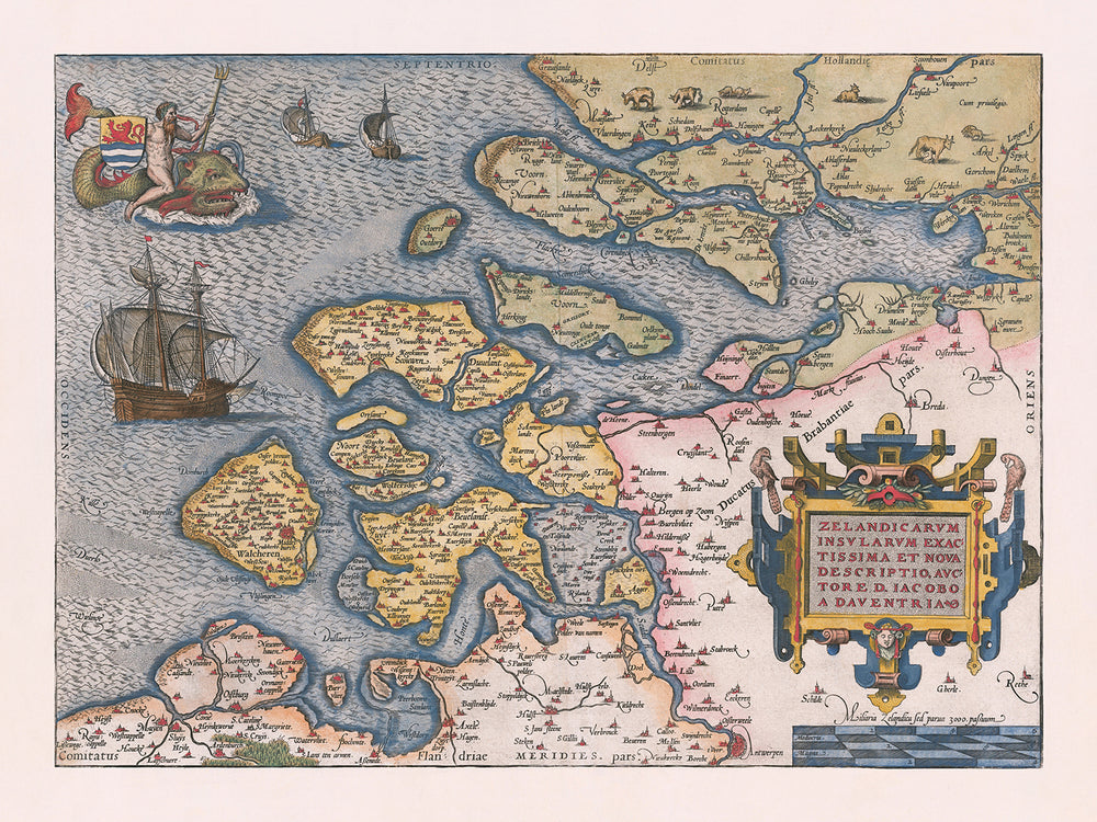 Este mapa no es sólo una representación geográfica sino un documento histórico que ofrece información sobre el mundo de finales del siglo XVI. Refleja la mezcla de ciencia y mitología que caracterizó la cartografía del Renacimiento, con sus precisos detalles geográficos y adornos artísticos. La presencia del escudo de armas, la rosa de los vientos y las barras de escala aumenta su valor histórico, convirtiéndola en una pieza fascinante para cualquier persona interesada en la historia de la cartografía, la navegación marítima o el rico patrimonio cultural de Zeelandia.