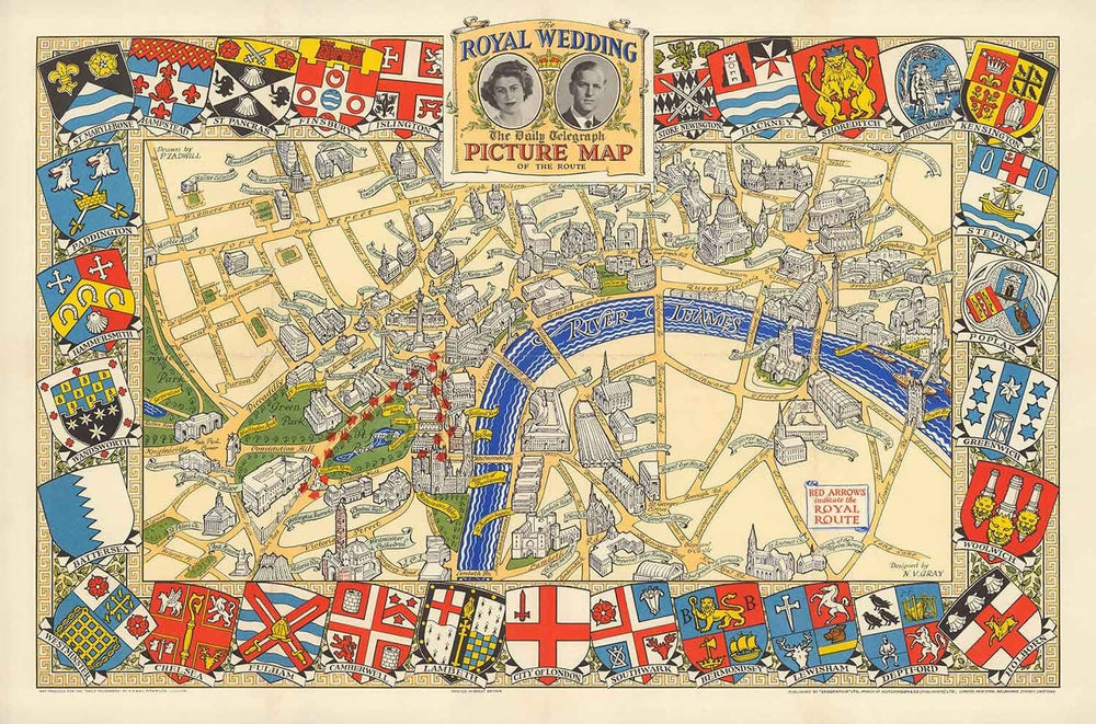 Publicado en el Daily Telegraph en 1947, este es, por supuesto, un mapa pictórico de la ruta tomada por la Reina Isabel II y el Príncipe Felipe en su día de boda - desde la Abadía de Westminster, subiendo por Whitehall, bajando por el Mall hasta el Palacio de Buckingham, y de regreso a la abadía.